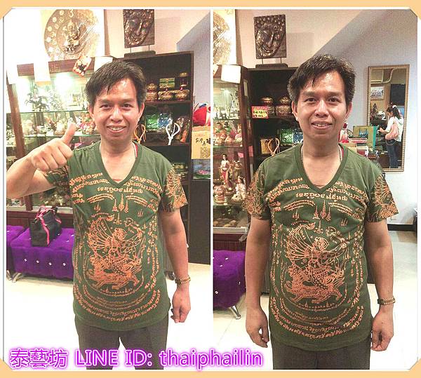 遠自 {{ 泰國 東北 }} 來台灣工作的好朋友,專程來泰藝坊請供了 {{ 哈奴曼天神 }} 經文 T 恤 ~ ~