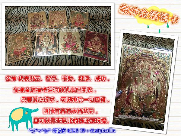 代表財富、智慧、權力、健康、成功,象神金箔福卡經過師傅高僧開光過,只要誠心祈求,可以排除一切困難,讓擁有者有大智慧開且可以帶來無比的好運跟祝福。